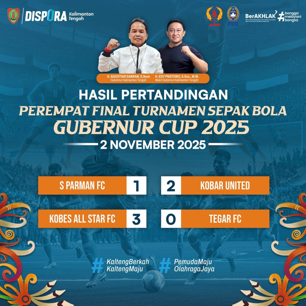 Berikut hasil pertandingan perempat final pada Turnamen Sepak Bola Gubernur Cup 2025 putaran provinsi yang berlangsung pada 2 November 2025 di Stadion Tuah Pahoe, Palangka Raya.