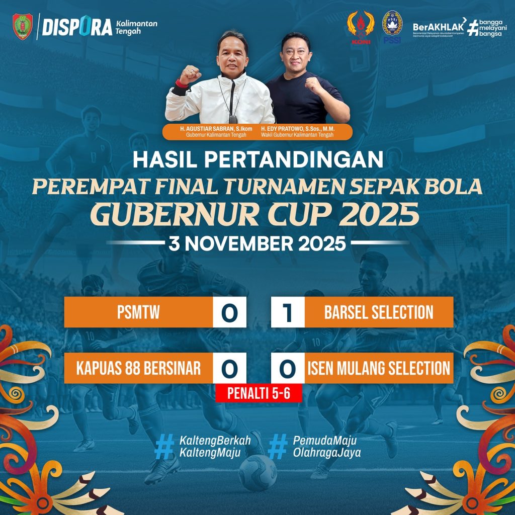 Berikut hasil pertandingan perempat final pada Turnamen Sepak Bola Gubernur Cup 2025 putaran provinsi yang berlangsung pada 3 November 2025 di Stadion Tuah Pahoe, Palangka Raya.